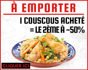 1 Viande au choix. Semoule de blé, légumes: carottes, navets, tomates, oignons, courgettes, raisins, pois chiche.